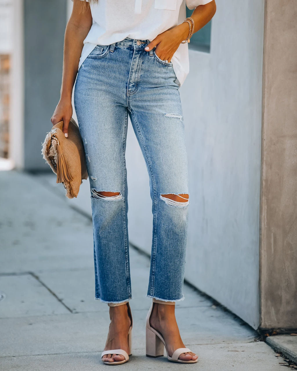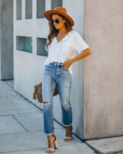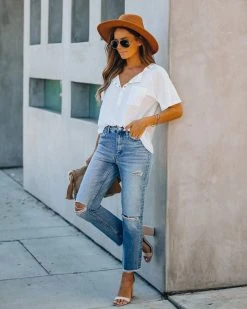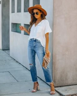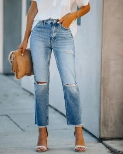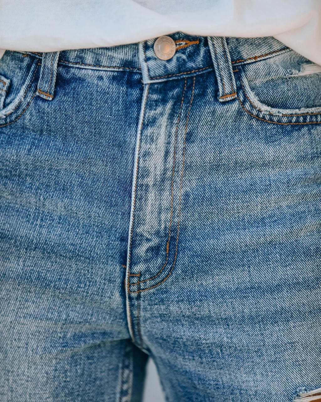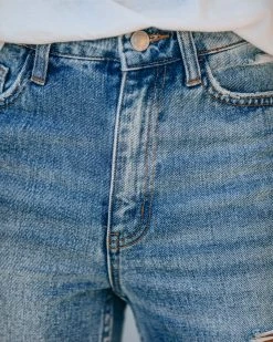 //Vervet Denim// We dig the medium wash on our Kris High Rise Distressed Denim featuring a high-rise fit and non-stretch distressed denim fabric! Designed with a raw hemline, classic 5 pockets and front fly zipper + button closures.