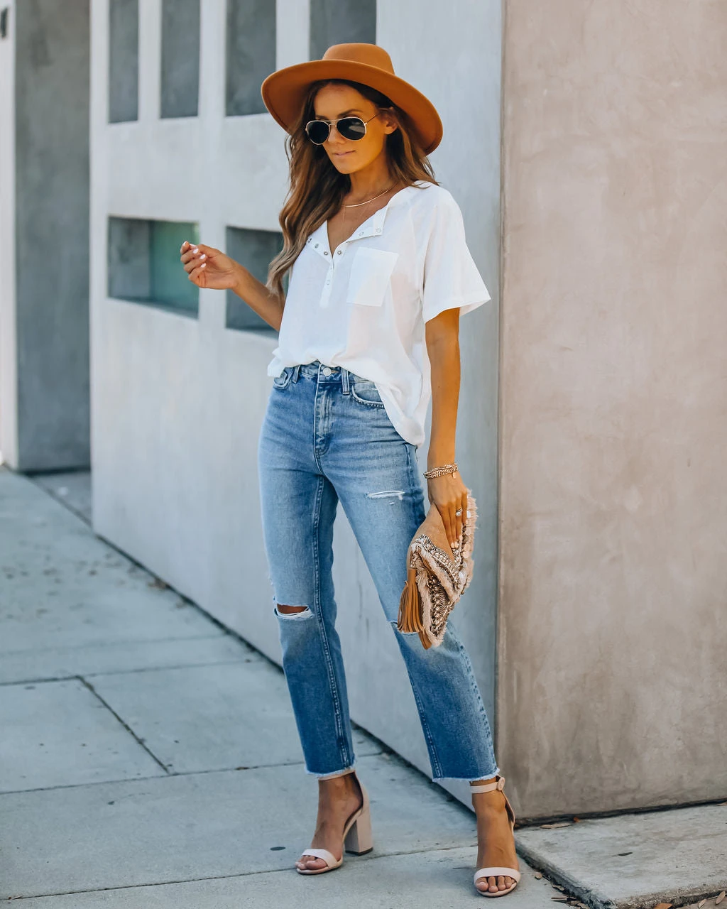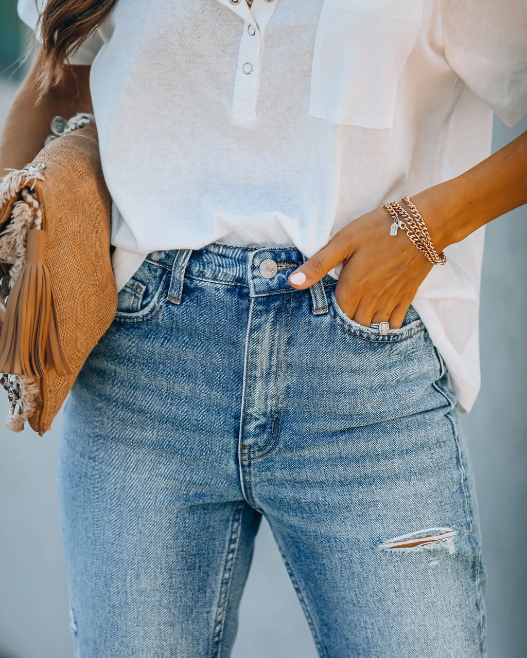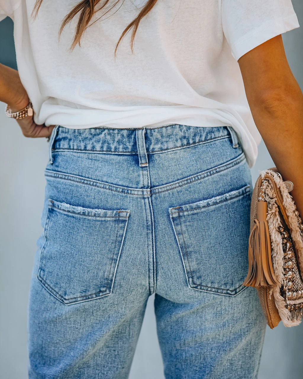 //Vervet Denim// We dig the medium wash on our Kris High Rise Distressed Denim featuring a high-rise fit and non-stretch distressed denim fabric! Designed with a raw hemline, classic 5 pockets and front fly zipper + button closures.
