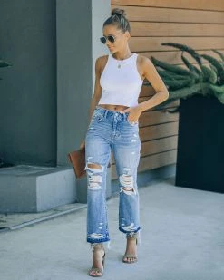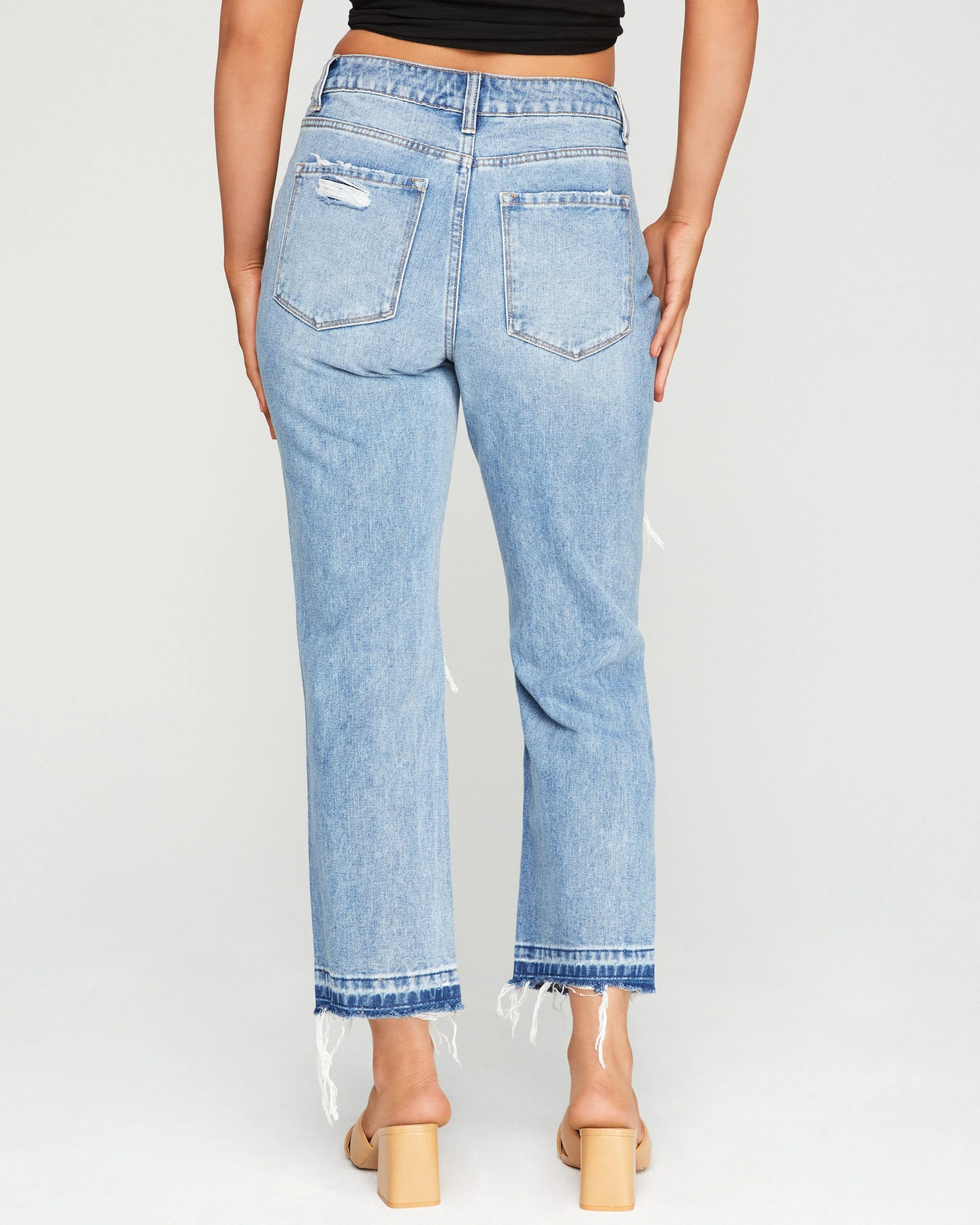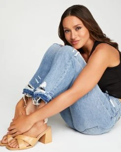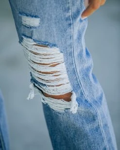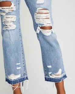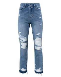 Perfect for everyday, the Neilson High Rise Distressed Straight Denim in medium blue wash that features distressing throughout.