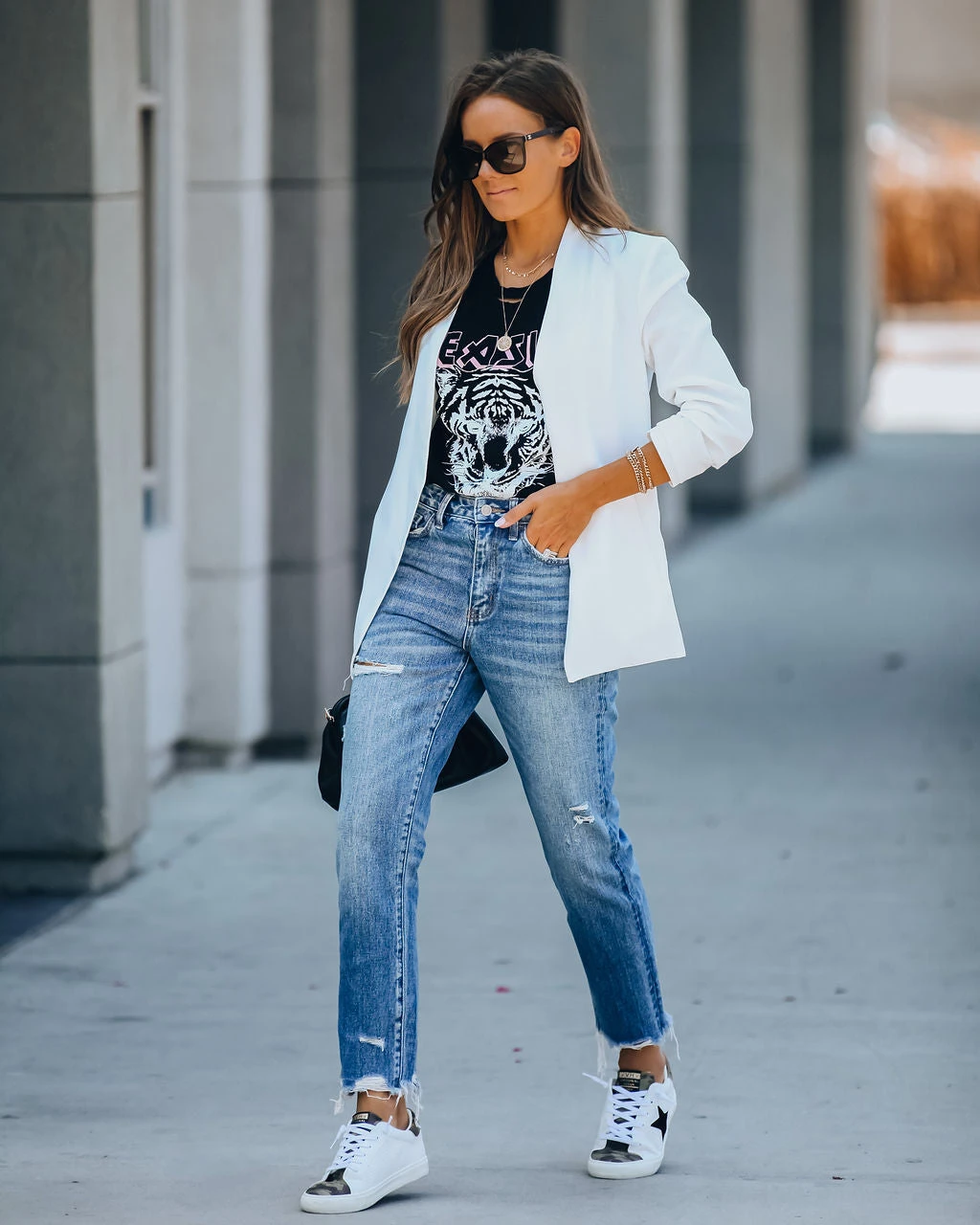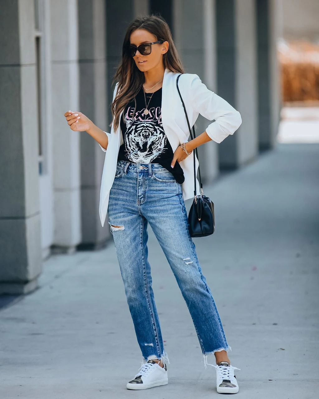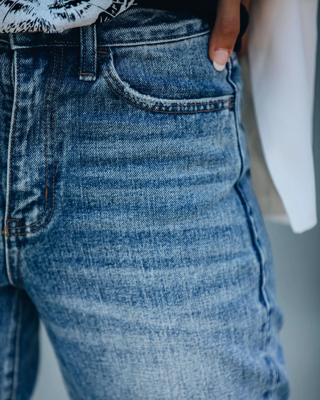 //Vervet Denim// Our Reward High Rise Distressed Denim are the coolest for the season! This subtly distressed pair comes constructed with a high rise, dark wash and heavily faded whiskering. The non-stretch cotton denim keeps the pair structured and the distressed details intact. A tailored straight leg and frayed hemline will update your denim collection! Finished with a classic five pocket style and a front zipper and button closure. Styled with the Chloe Mini Necklace, The Buddha Wheel Necklace, Kelsey Chain Bracelet, Not So Easy Tiger Cotton Tee, Uptown Girl Pocketed Blazer, Protocol Perforated Camo Sneaker and the Cannes Mini Faux Leather Crossbody Pouch Bag.