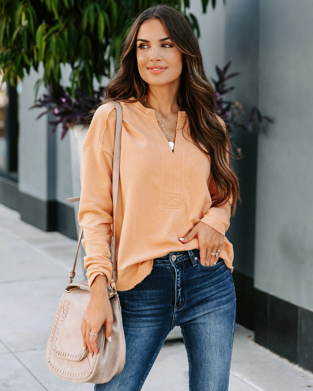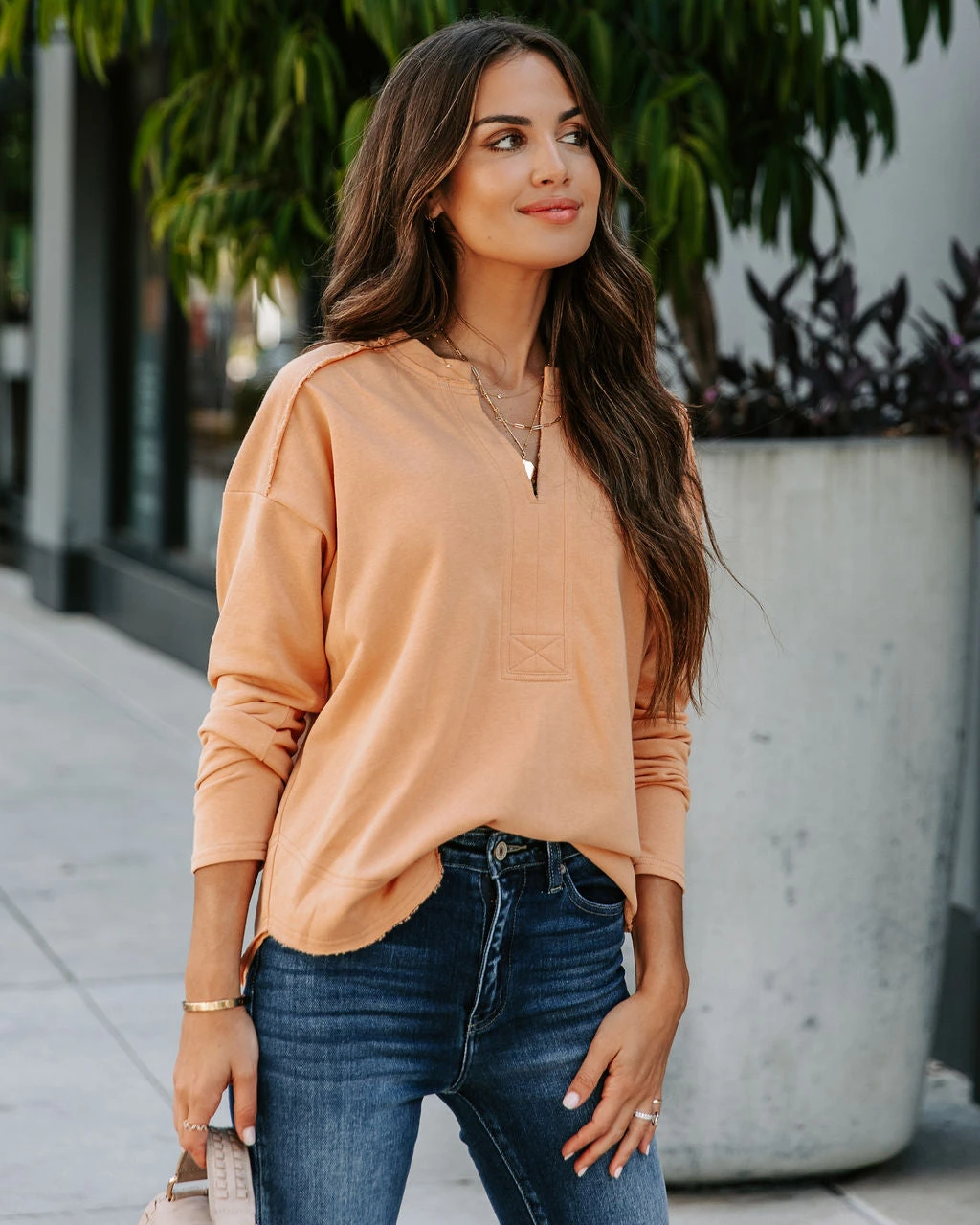 Classic and comfy, the Zoelle Cotton Blend Lightweight Pullover in salmon that features a split neckline.ย ย