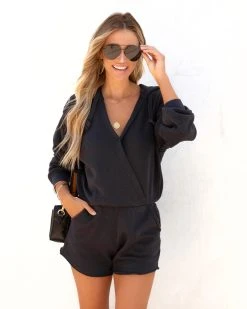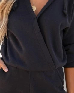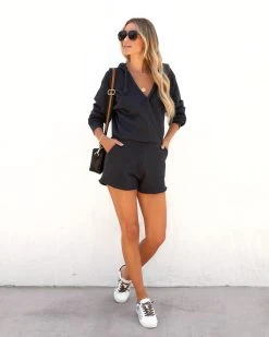 Shop around town in the Burke Cotton Pocketed Hoodie Romper in black that features an elastic waistband.