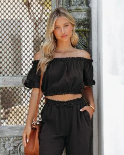 Go on a Summer date in the Mariela Cotton Off The Shoulder Crop Top in black that features a textured fabrication.