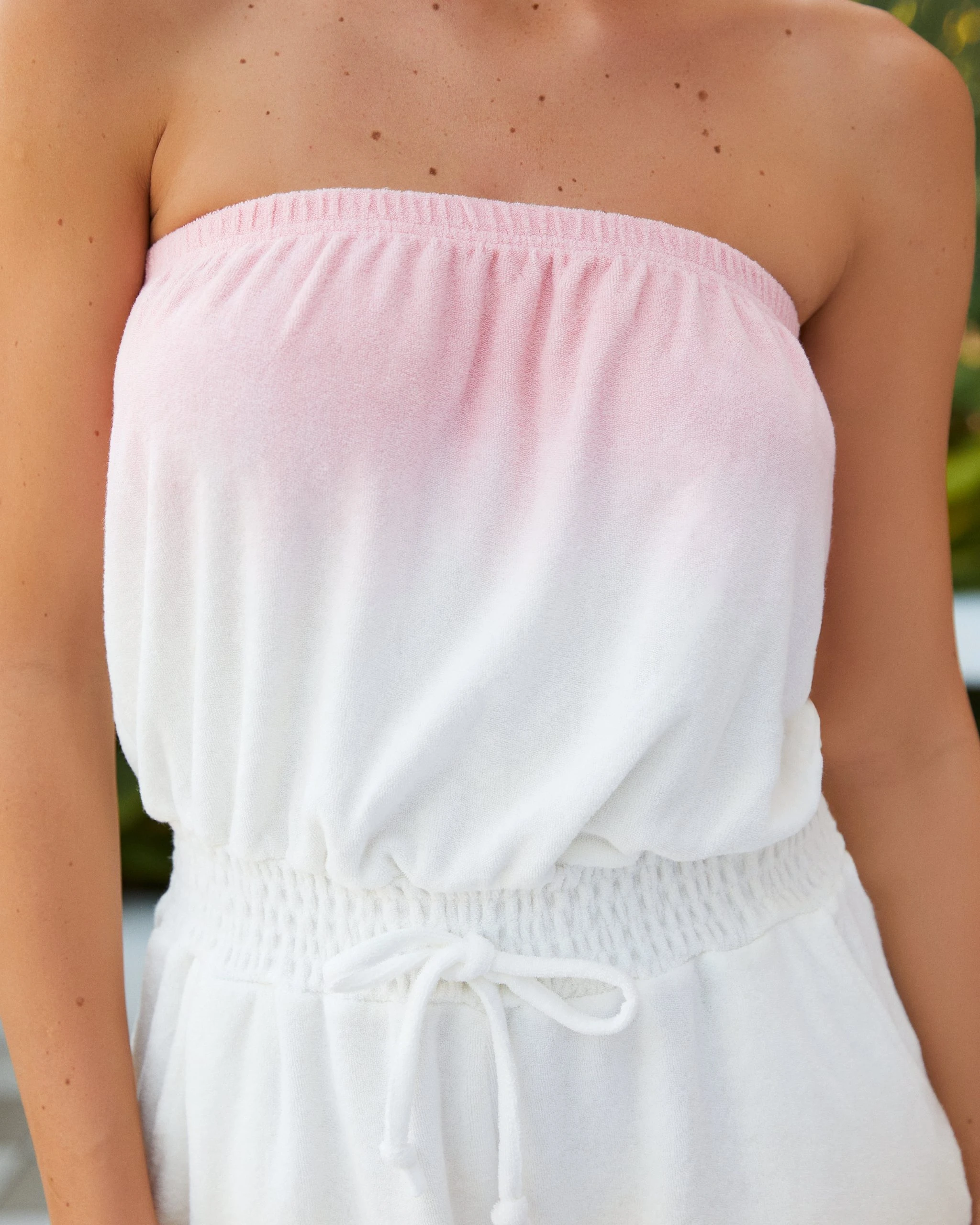 After the pool, throw on our Shades Of Summer Ombre Terry Cloth Pocketed Romper in pink and white that features a sewn tie.