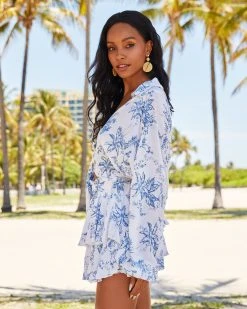 We’re loving the romantic vibes of the Toille Sands Buckle Tie Crop Top in blue and white that features a back elastic waistband.