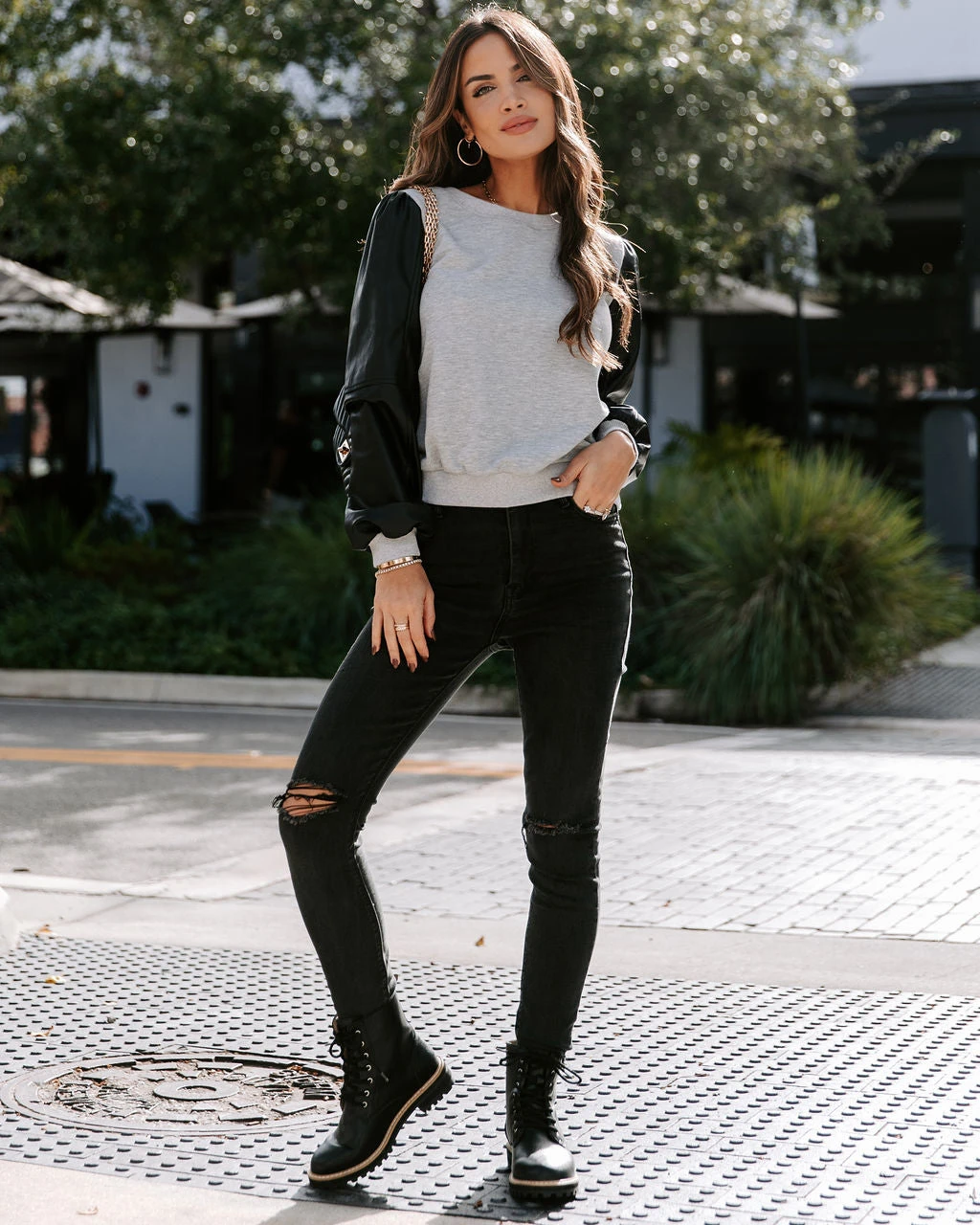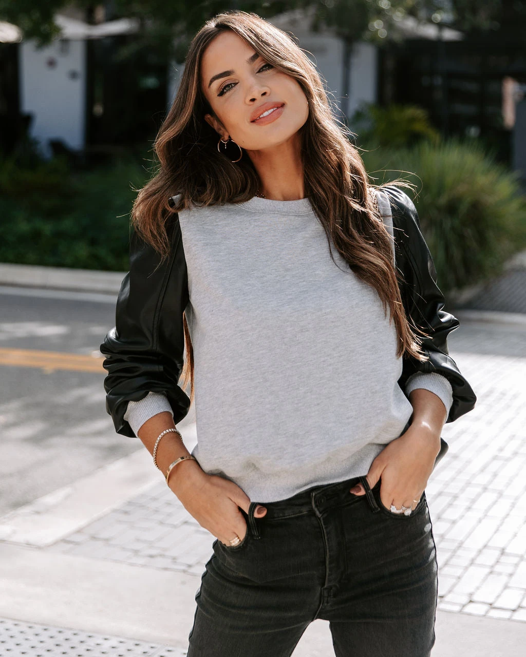 Upgrade your style in the Bronx Faux Leather Contrast Sweatshirt in grey that features a crew neckline.Â