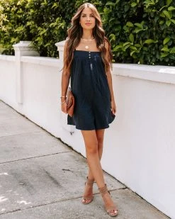 Stroll around town in the Andrina Cotton Pocketed Romper in navy that features a square neckline.