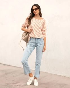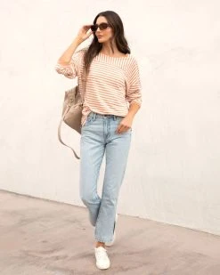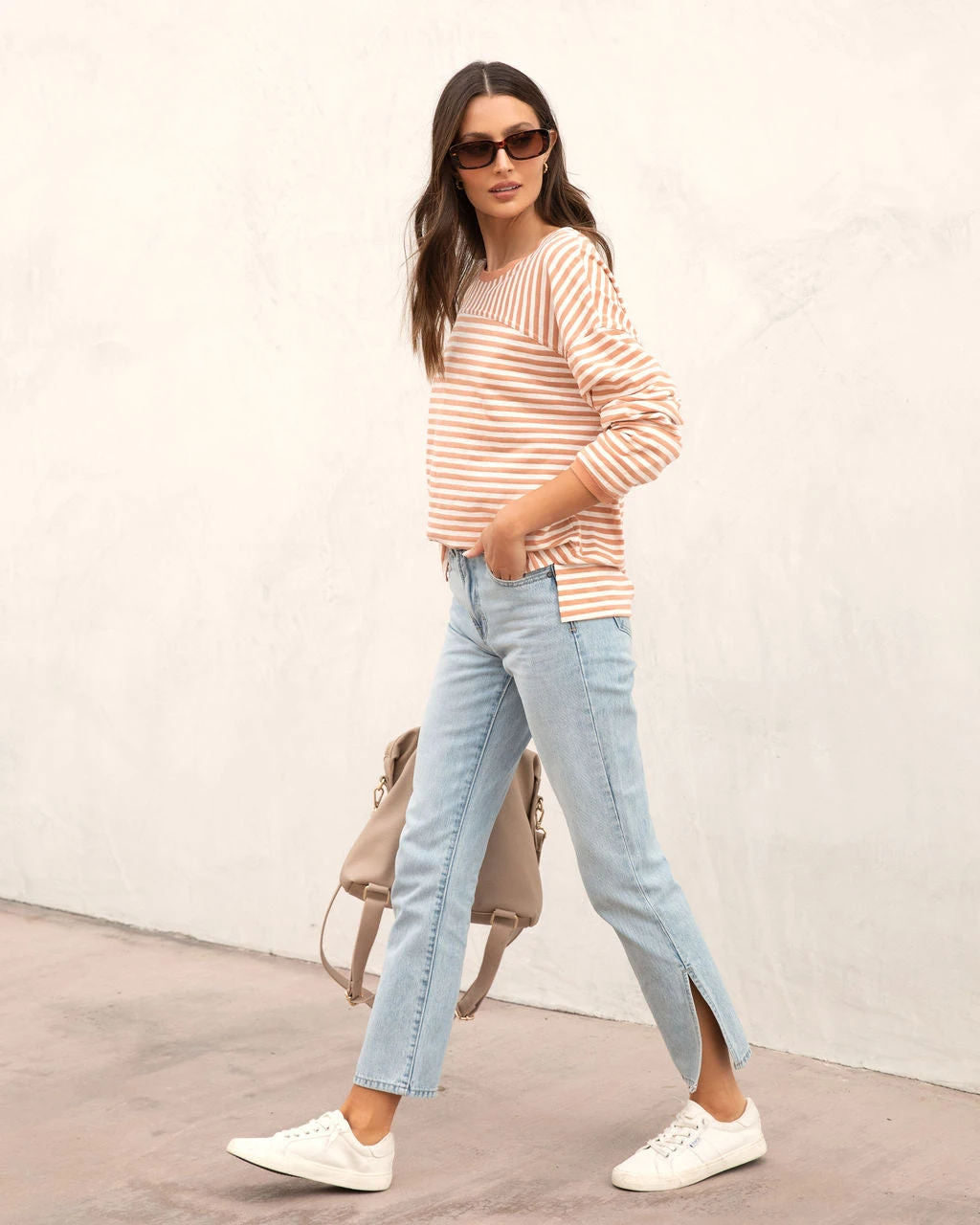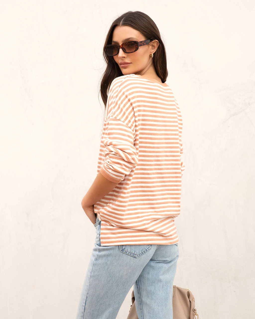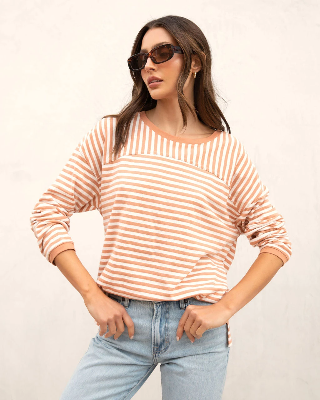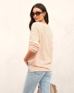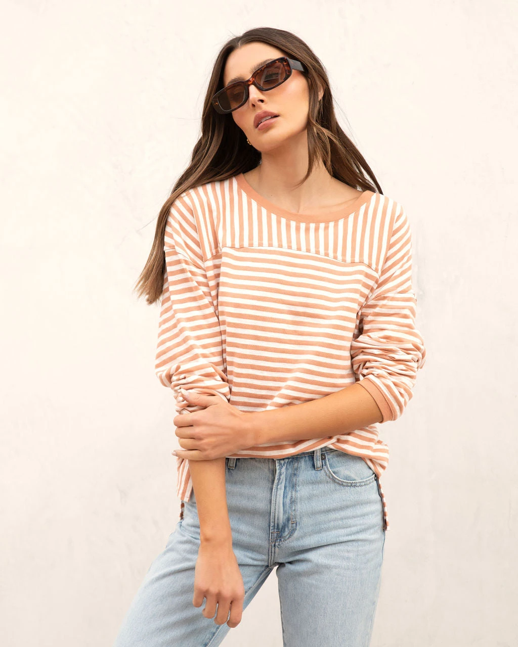 Classic meets casual in the Mason Striped Cotton Blend Top in peach and white that features a relaxed fit.