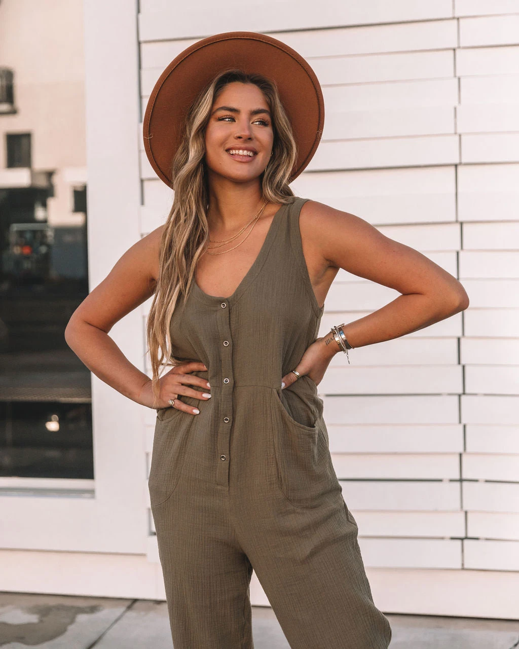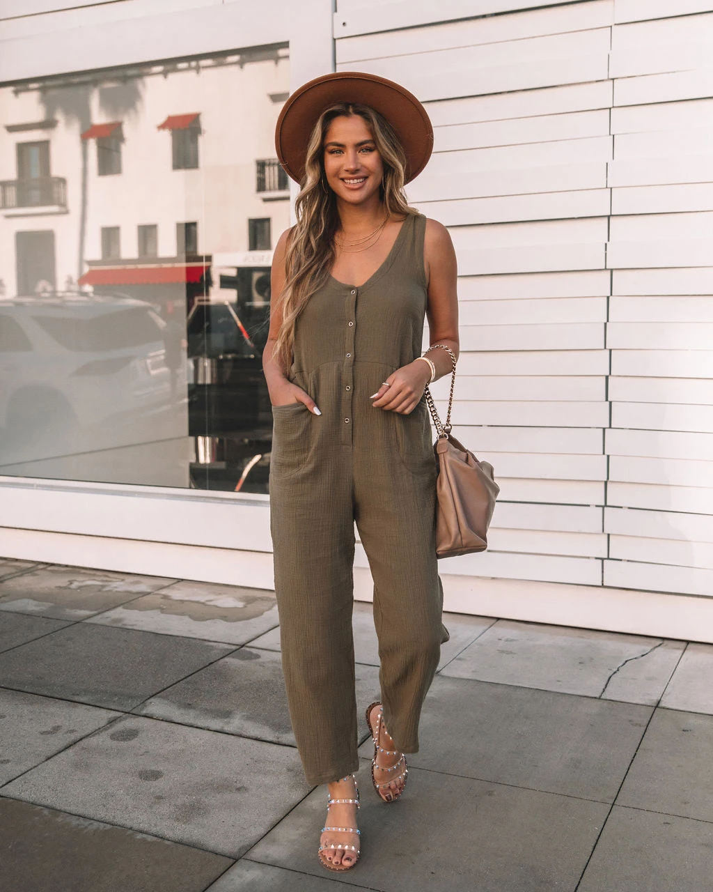 Our favorite throw on and go look! Our Westlynn Cotton Pocketed Jumpsuit in olive features a scooped neckline. Designed with front button closures and side pockets. Styled with the Destiny Chain Hat, Perfect Hoop Earrings, Layers Of My Heart Necklace, Elegance Slouchy Chain Handbag, and Venus Studded Strappy Sandal.
